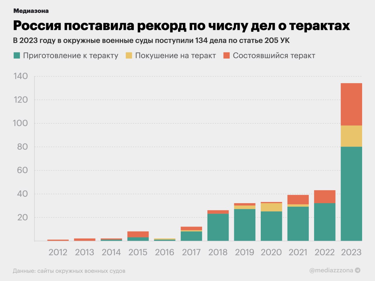 «Медиазона» пишет, что в 2023 году в суды передали 134 дела статье о теракте (205 УК) и это в три раза больше, чем годом ранее. В большинстве дел речь идет о том, что спецслужбы называют предотвращёнными терактами — то есть, когда обвиняемых задерживают якобы еще на стадии подготовки.