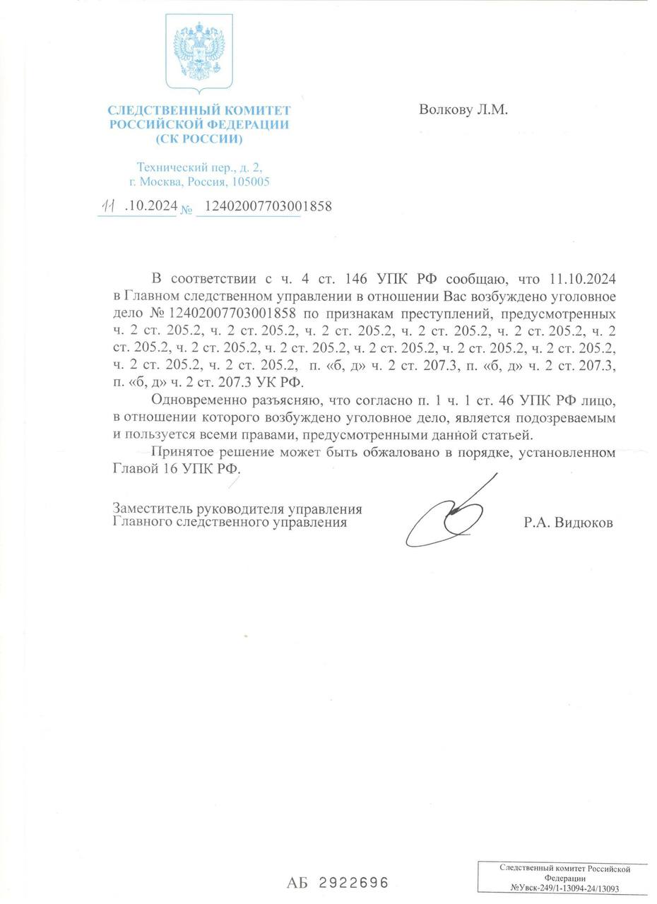 Следственный комитет РФ возбудил против Леонида Волкова уголовное дело об «оправдании терроризма» и распространении «фейков» про армию. В нём насчитывается 16 эпизодов. Об этом Волков сообщил в своём Telegram-канале: