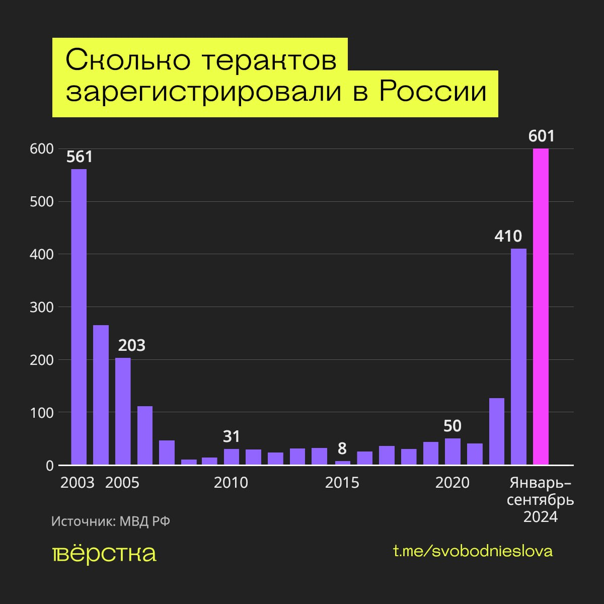 - Это на 7% больше, чем в рекордном 2003 году, с которого ведомство ведёт статистику. Тогда МВД отчитывалось о совершении 561 теракта. С тех пор количество терактов в России падало в течение пяти лет, а следующие 13 лет находилось на плато — в диапазоне от восьми до 50 терактов ежегодно;