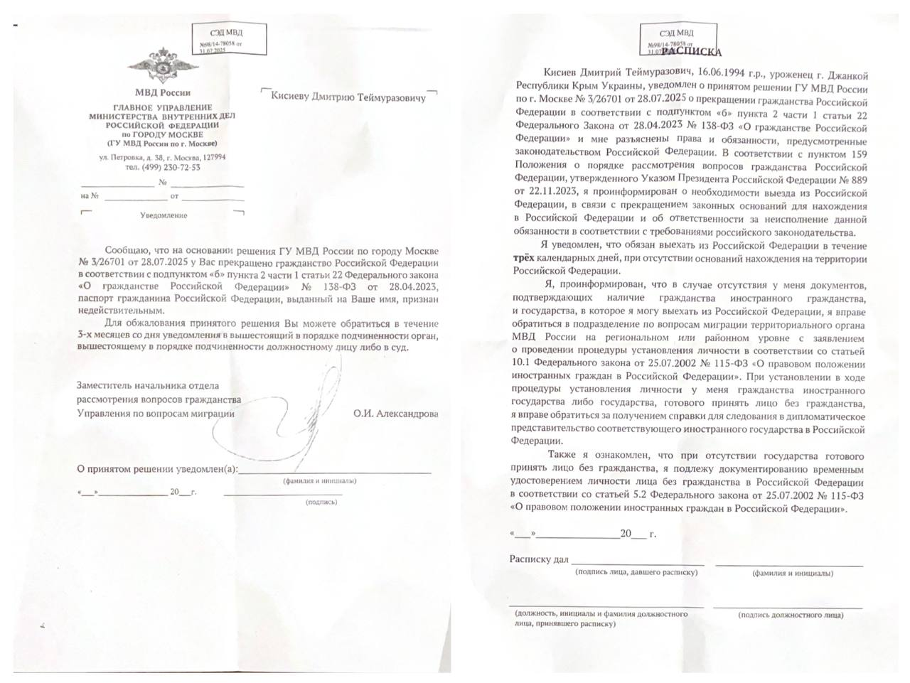 Кисиев обжаловал лишение гражданства в Щербинском районном суде Москвы, рассмотрение его иска ещё не завершилось.