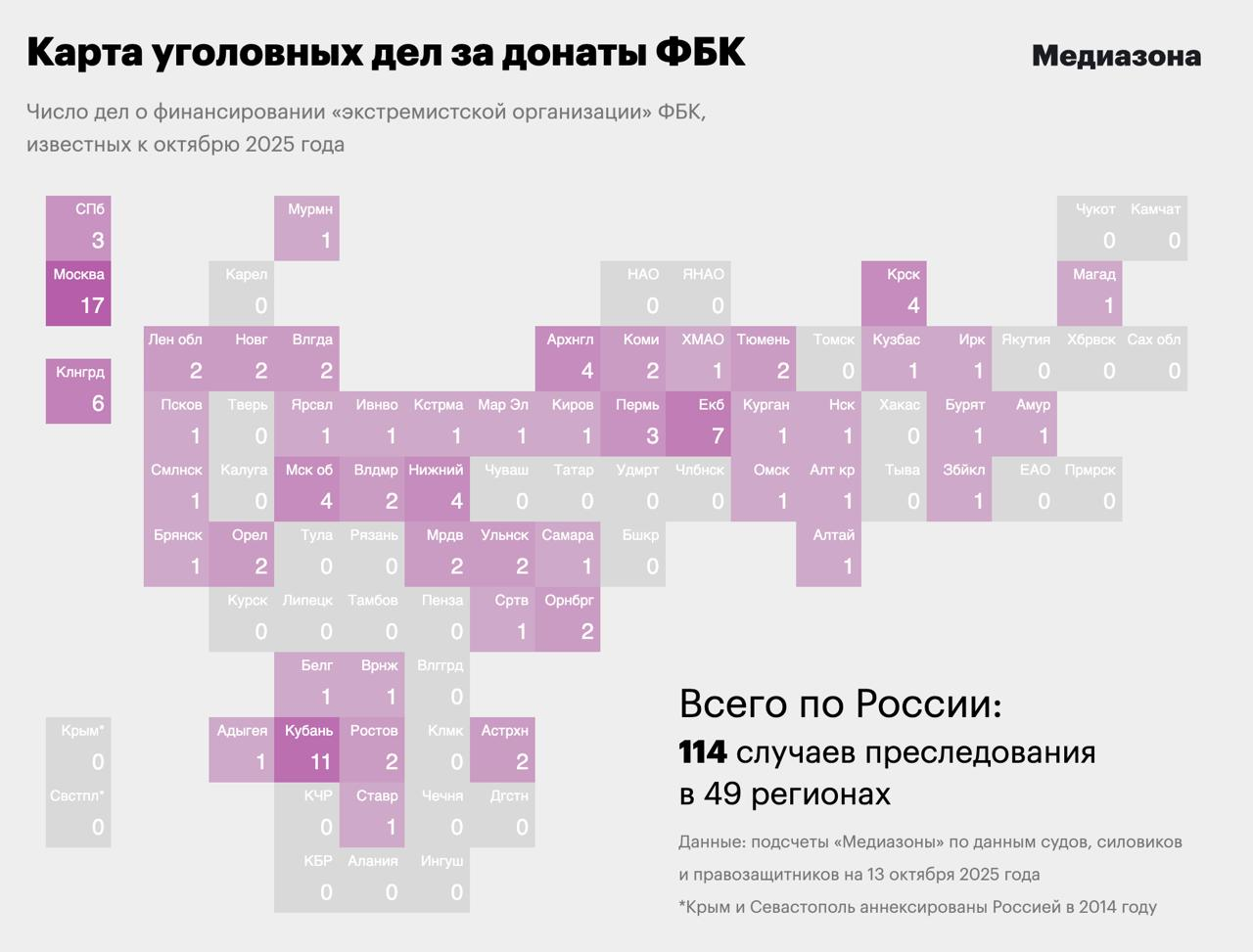 Согласно обновлённым подсчётам издания «Медиазона», за переводы ФБК преследуют уже как минимум 114 человек.