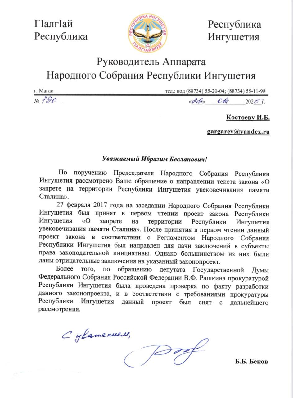 Историк и автор проекта «Народная история» Ибрагим Костоев сообщил, что Народное собрание Республики Ингушетия тайно сняло с рассмотрения законопроект «О запрете на территории Республики Ингушетия увековечивания памяти Сталина». По его словам, в ходе недавнего запроса он не смог найти на официальном сайте республиканского парламента текста закона — и после обращения получил ответ, что «в соответствии с требованиями прокуратуры республики данный проект был снят с дальнейшего рассмотрения». Ранее о снятии с повестки не сообщалось.