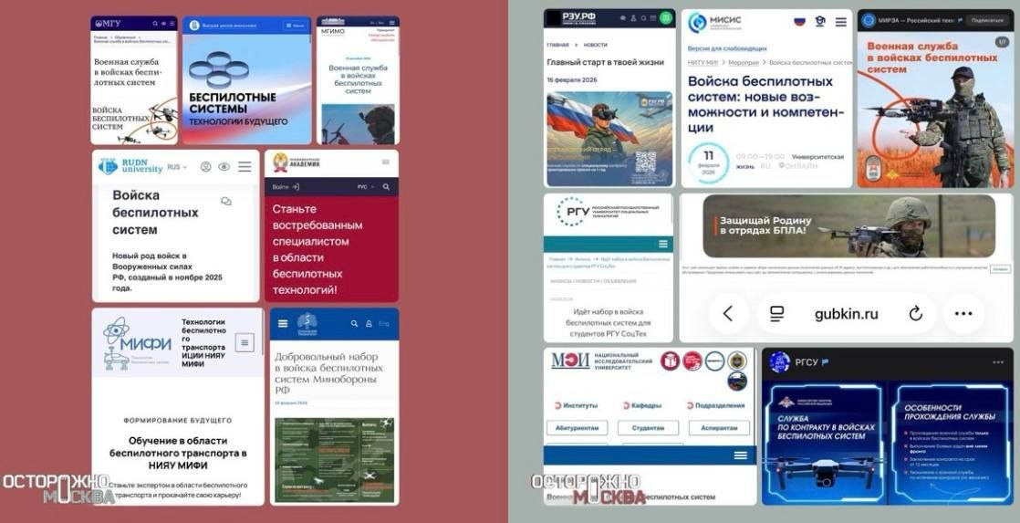 Московские вузы разместили на своих сайтах и в соцсетях агитацию к участию во вторжении в Украину. Агитматериалы появились на официальных сайтах МГУ, ВШЭ, МГИМО, РУДН, РАНХиГС, МИФИ, МИСИС, МИРЭА, РГУ, МАИ, РГГУ, РГСУ и других московских университетов, обратило внимание издание «Осторожно, Москва».