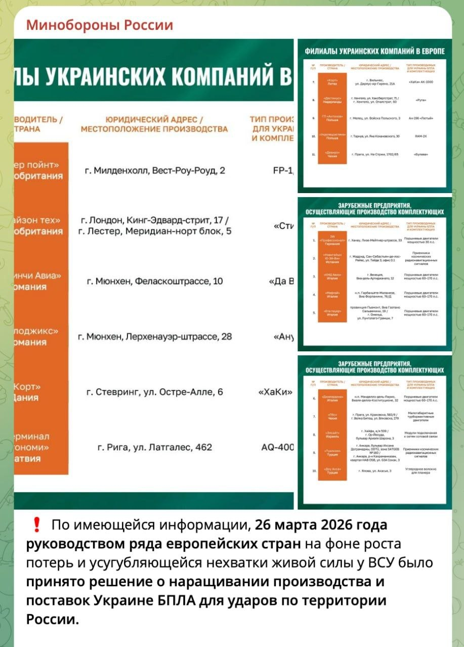 По имеющейся информации, 26 марта 2026 года руководством ряда европейских стран на фоне роста потерь и усугубляющейся нехватки живой силы у ВСУ было принято решение о наращивании производства и поставок Украине БПЛА для ударов по территории России <…>